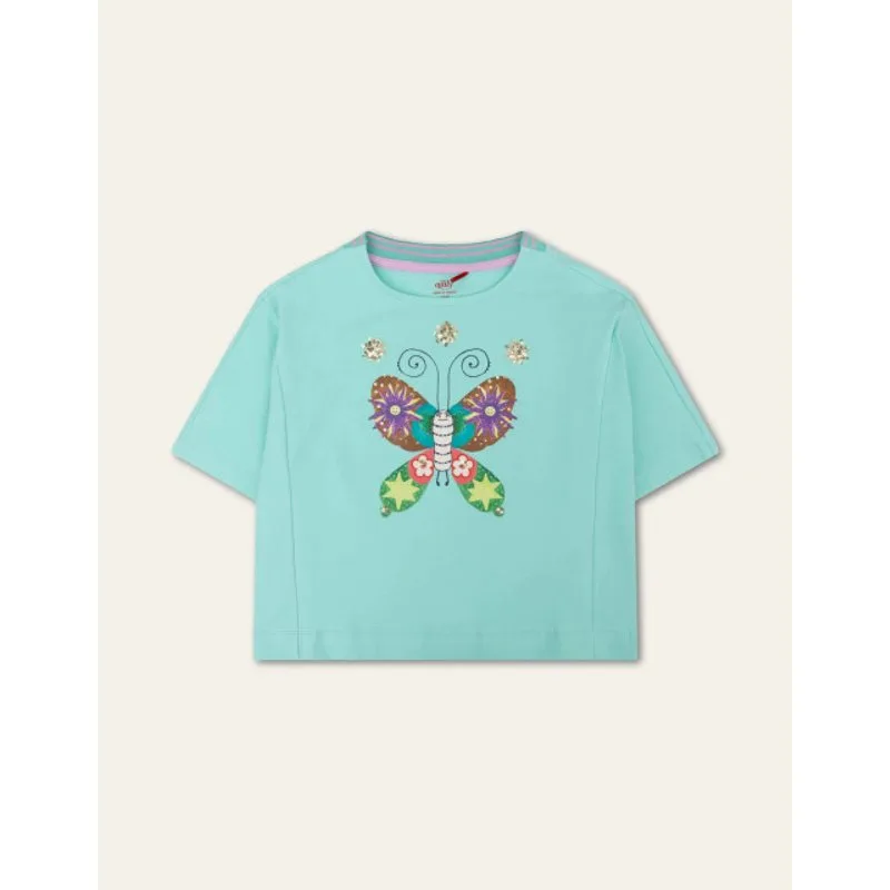 Draag deze zonnige vlinder en je voelt je gelijk vrij en vrolijk. De vlinder op dit losvallende shirt heeft stralende ogen, zonnetjes op de vleugels en glinsterende kralen. Straal je mee? - Organisch Katoen met Elastaan - Loose fit - Gemaakt in Noord-Macedonië