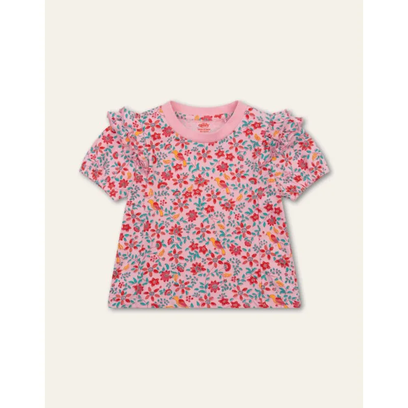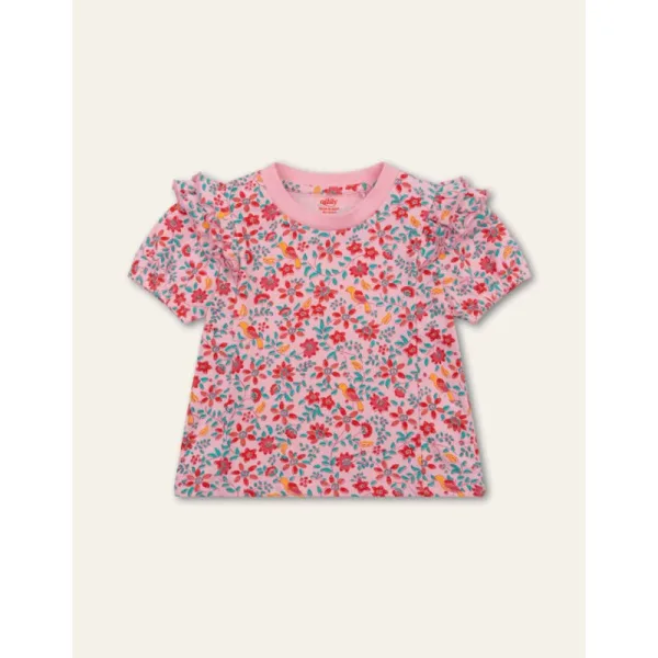 Comfortabel en stretchy t-shirt met speelse ruffels op de mouwen en een print van kleine bloemetjes en een pauw. -95% katoen, 5% elastaan -Gemaakt in India