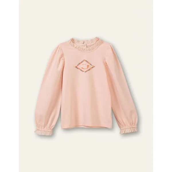 Less is more? Nee, more is more! Dit shirtje gaat er helemaal voor – met lieve ruches op de kraag en mouwen, plooitjes bij de schouders, glanzende drukknoopjes aan de achterkant en centraal ons emoji logo met glittertjes. - Katoen met stretch - Drukknoopsluiting - Regular fit