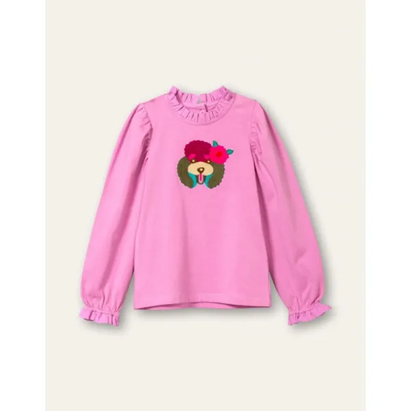 Less is more? Nee, more is more! Dit shirtje gaat er helemaal voor – met lieve ruches op de kraag en mouwen, plooitjes bij de schouders, glanzende drukknoopjes aan de achterkant en centraal onze vrolijke Softies-pup met bloem boven z'n oor. - Katoen met stretch - Geborduurde patch - Drukknoopsluiting - Regular fit
