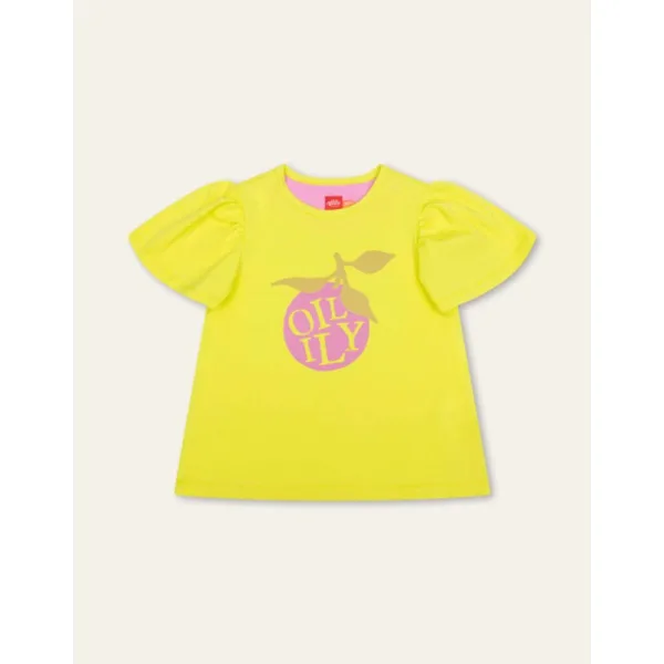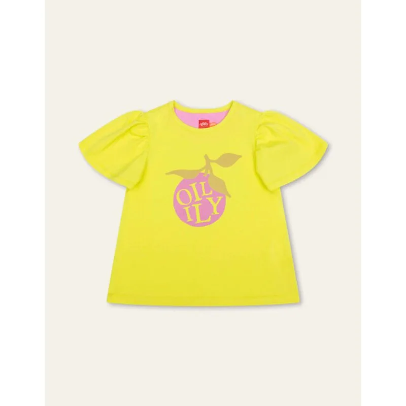 Oilily hangt als een kersje op je buik te wachten op allerlei zomerse avonturen. In dit limoengele shirt met pofmouwen zullen jullie er ongetwijfeld veel beleven. - 95% Organic Katoen, 5% Elastaan - Gemaakt in Portugal