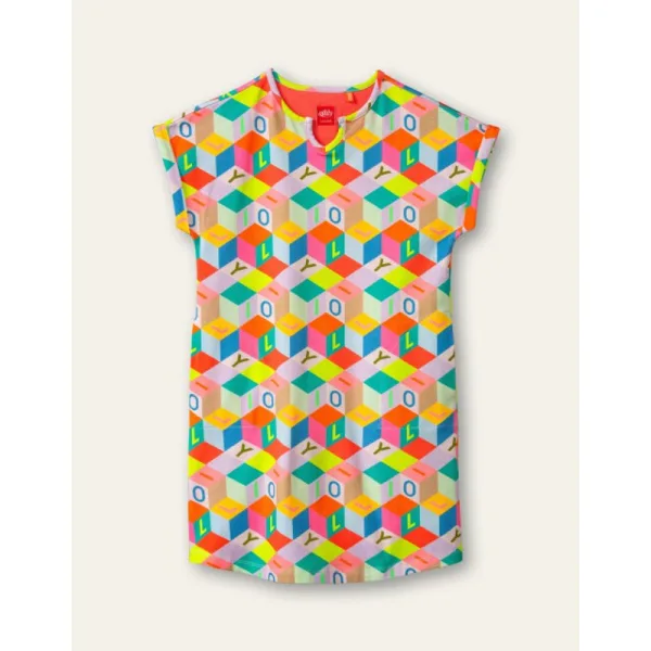 Ken je dat spelletje tijdens lange autoritten waarbij je alle rode auto's moet tellen? Waarom tel je nu niet alle oranje blokken op je jurk? Of alle letters O of L? Je verveelt je nooit meer met deze bio-katoenen jurk met korte mouwen.