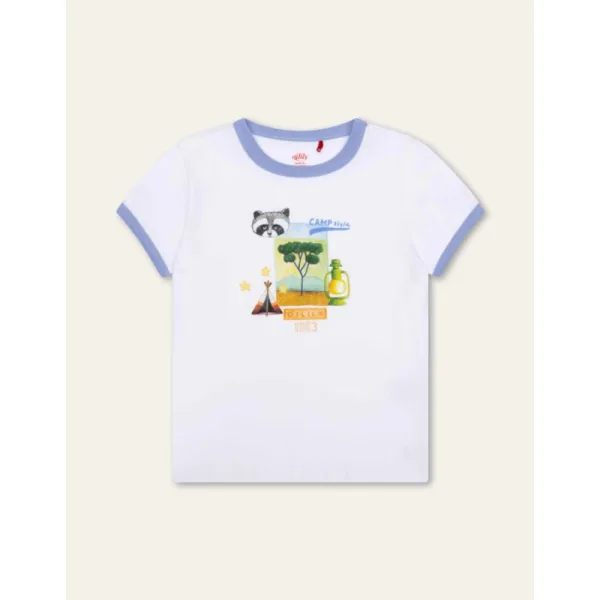 Voel de retro-vibe in dit fris witte shirtje. Met onze leuke kampeertekeningen erbij én onze niet-te-missen vrolijke wasbeer ben je helemaal zomerklaar in dit shirt. - 96% Organic Cotton, 4% Elastane - Gemaakt in N-Macedonië