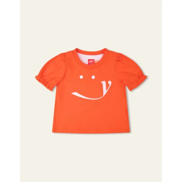 Gepofte mouwtjes, lekkere stretchy hals en een ondeugende smiley – dit shirtje is een gezellige basic dat je heerlijk kan mixen en matchen. - Organisch Katoen met Elastaan - Fitted - Gemaakt in Portugal