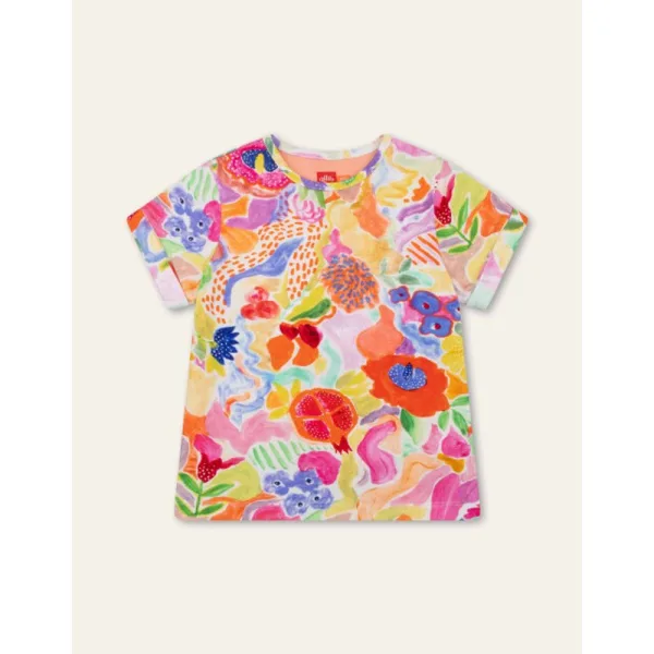 Met verf doodlen we vrolijk gekleurde bloemen en sierappeltjes voor op dit zomerse t-shirt van zacht organisch katoen. -94% organisch katoen, 6% elastaan -Gemaakt in Portugal