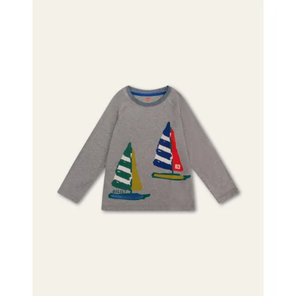 De twee boten op dit shirt zijn met de hand getekend en hebben vrolijke kleuren. De ribboord heeft een speels yarn dye streepje als finishing touch. -100% Katoen -Gemaakt in India