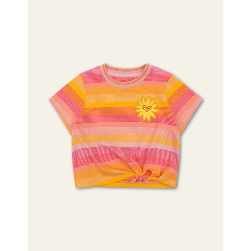 Zomers cropped t-shirt met knot. De yarn-dyed streep in roze tinten is geïnspireerd op Jaipur, de Roze Stad van India – symbool van gastvrijheid en zonneschijn. Perfect voor zonnige dagen! -100% katoen -Cropped -Gemaakt in India