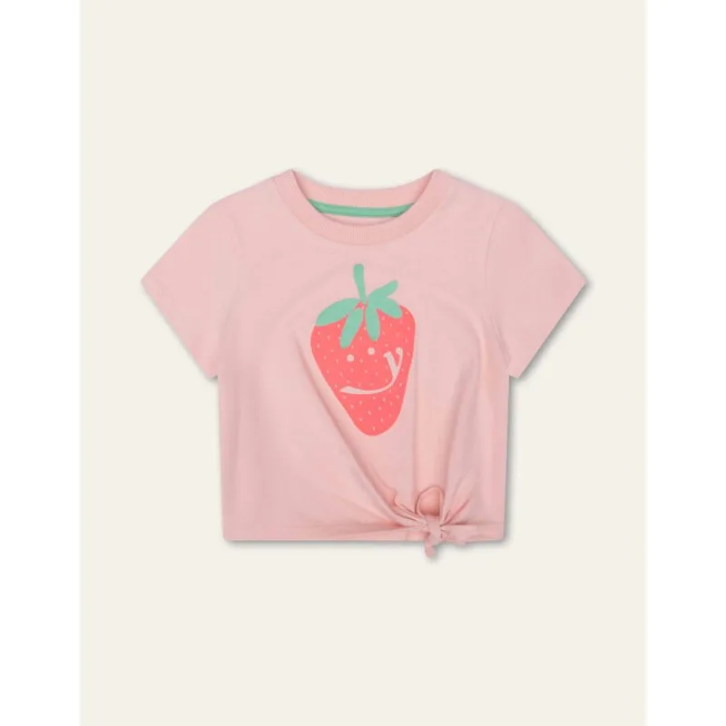 Cute crop top met knoopje in lief roze met grote zoete, ondeugende smiley- aardbei. Perfect voor schattige, ondeugende kindjes zoals...jij! - 96% Organic Katoen, 4% Elastaan - Gemaakt in Bulgarije