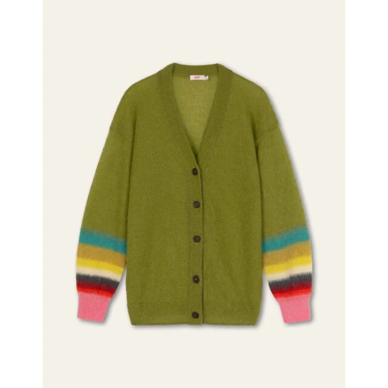 Dit is een grandpa cardigan in brushed mohair. De kleurovergangen op de mouwen hebben een speels patroon zodat je een gradient krijgt. Wij raden aan dit item gevouwen in de kast te bewaren en niet op te hangen om de vorm te behouden. -50% Mohair, 30% Polyamide, 20% Wol -Gemaakt in Roemenië, gebrushed in Italië -Het model is 176cm en draagt maat 36