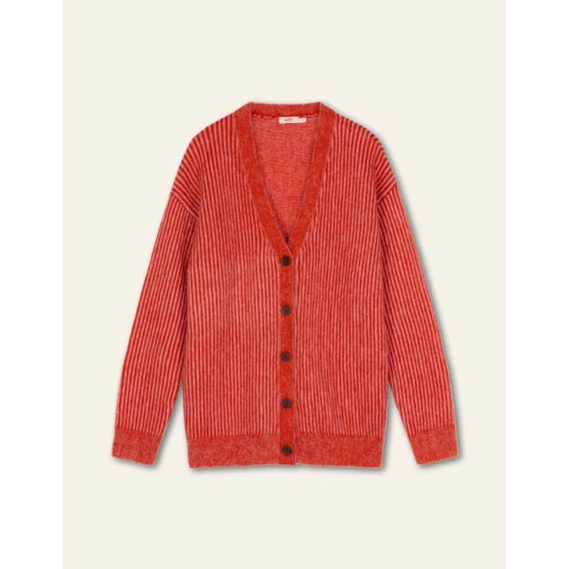 Deze mohair grandpa cardigan is in jacquard gebreid met smalle strepen. Het is een mix van mohair met wol, dus heerlijk zacht en warm. Wij raden aan dit item gevouwen in de kast te bewaren en niet op te hangen om de vorm te behouden. -34% RMS Certified Mohair, 34% RWS Certified Wool, 32% Polyamide -Gemaakt in Roemenië