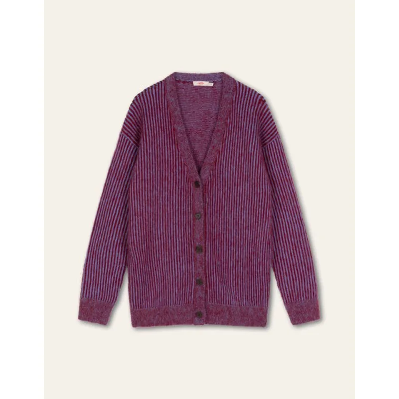 Deze mohair grandpa cardigan is in jacquard gebreid met smalle strepen. Het is een mix van mohair met wol, dus heerlijk zacht en warm. Wij raden aan dit item gevouwen in de kast te bewaren en niet op te hangen om de vorm te behouden. -34% RMS Certified Mohair, 34% RWS Certified Wool, 32% Polyamide -Gemaakt in Roemenië -Het model is 176cm en draagt maat 36