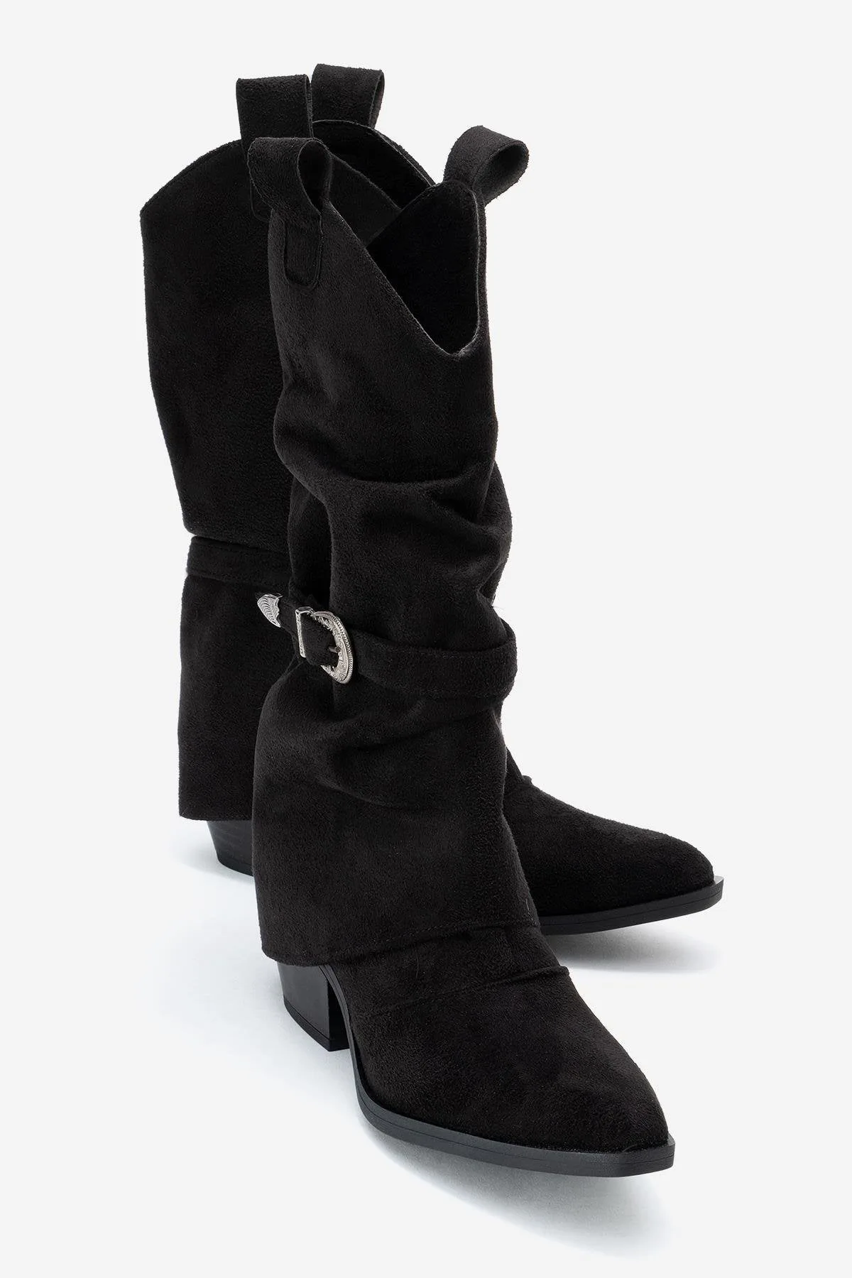 Een eigentijdse enkellaars met western-geïnspireerde hardware en een strakke, gestructureerde silhouet