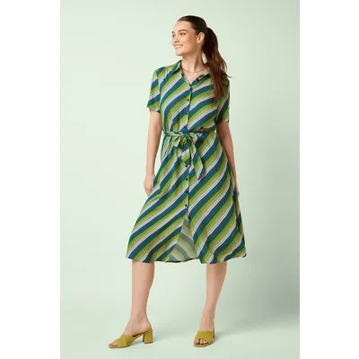 “Stripe it till you like it!” Deze midi doorknoopjurk is speels én vrouwelijk dankzij de top met puntig kraagje, korte mouwen en het afneembare striklint dat je taille prachtig accentueert. Ze is uitgevoerd in een heerlijk soepele EcoVero viscosemix (stretcht niet) met een frisse gestreepte print in groen, crème en blauwtinten. * Midi model * Doorknoopjurk * Puntig kraagje * Korte mouwen * Afneembare strikband voor een extra ‘snatched’ taille * It has pockets! * Reikt bij een lengte van 1,70 m tot op de kuit