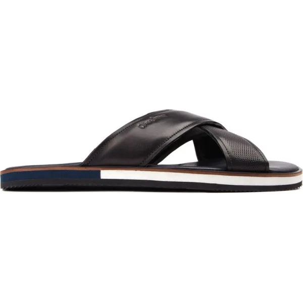 Zwarte Oliver Sweeney Memphis-sandalen voor heren, vervaardigd van leer en een rubberen zool. Kenmerken: comfortabel voetbed, bovenwerk van volnerf leer, gripzool en merklogo in reliëf.