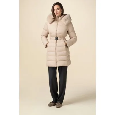 Oltre Midi Down Jacket With Belt And Furry Edge Beige