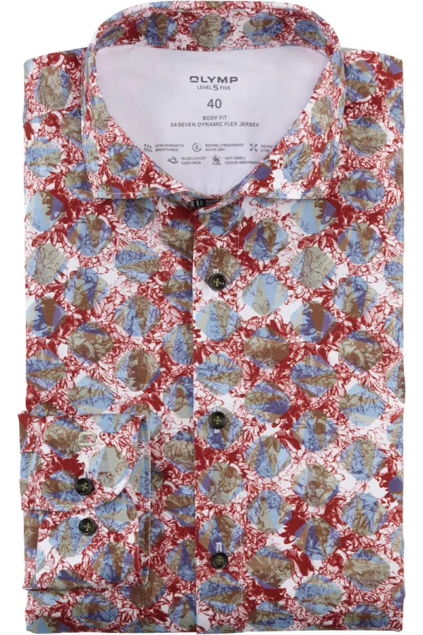 - Bij Overhemden.com kun je OLYMP Level Five 24/Seven Dynamic Flex Body Fit Jersey shirt blauw/rood/wit, Motief kopen voor slechts €35,95