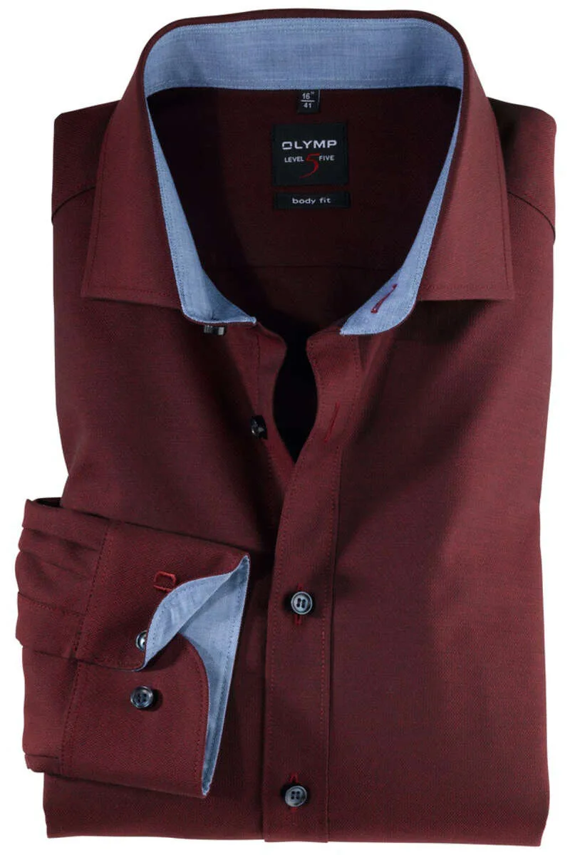 - Bij bol.com kun je OLYMP Level 5 body fit overhemd - bordeaux rood structuur (blauw contrast) - Strijkvriendelijk - Boord kopen voor slechts €73,00 , dat is 9% goedkoper dan bij Overhemden.com (€79,95).