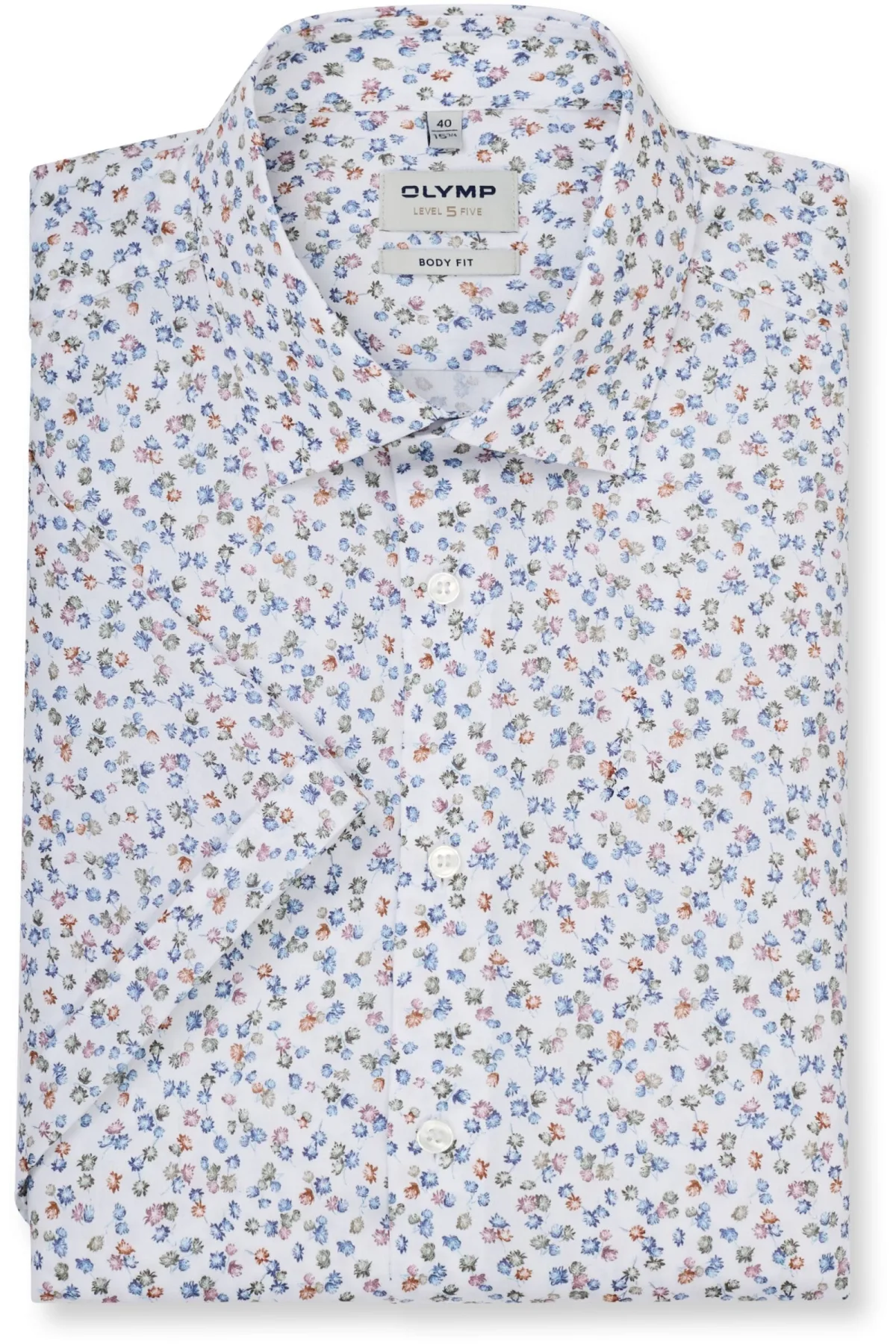 heren vrijetijdsoverhemd van OLYMP Level Five;elastische katoenmix;slim fit;bloemenprint all-over print;kentkraag;Met korte mouwen design;Doorlopende knoopsluiting;ruglengte bij maat 40: 71 cm;schouderbreedte bij maat 40: 44 cm;Mouwlengte bij maat 40: 23 cm