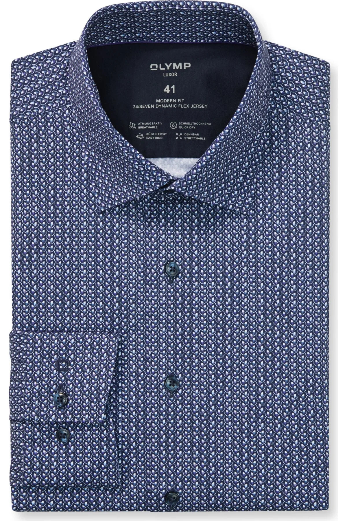 - Bij Overhemden.com kun je OLYMP Luxor 24/Seven Jersey shirt marine, Bedrukt kopen voor slechts €94,95