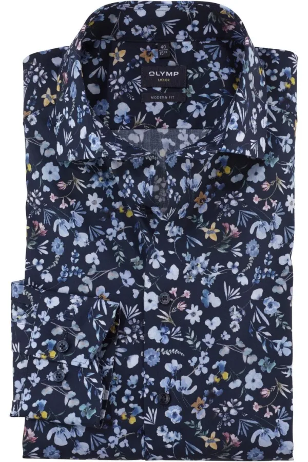 OLYMP Luxor Modern Fit Overhemd marine, Bedrukt Prijzen