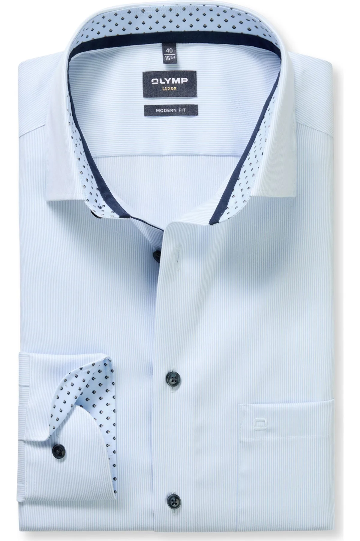 - Bij bol.com kun je OLYMP Luxor modern fit overhemd - twill - lichtblauw met wit heel fijn gestreept - Strijkvrij - Boord kopen voor slechts €64,85 , dat is 19% goedkoper dan bij Steegengamode (€79,95).
