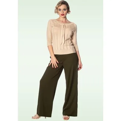 Ga voor de ‘safari chique’ look dit seizoen met deze On the Nile Palazzo Trousers in Khaki! De elegante, wijde pijpen bewegen gracieus met je mee bij iedere stap die je neemt en vormen een prachtig contrast met de hoge taille voorzien van een beige velvet band. Uitgevoerd in een glad en soepelvallend, kakigroen stofje met een hele lichte stretch die heerlijk draagt. * Hoog taille model * Wijde pijpen * Zijwaartse steekzakjes * Rits- en haaksluiting voorzijde * Makkelijk in te korten