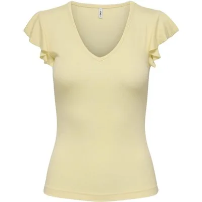 Specificaties: * Pasvorm: regular fit; diepe v-hals; kapmouwen * Kleur: geel * Materiaal: 95% viscose - 5% elastaan
