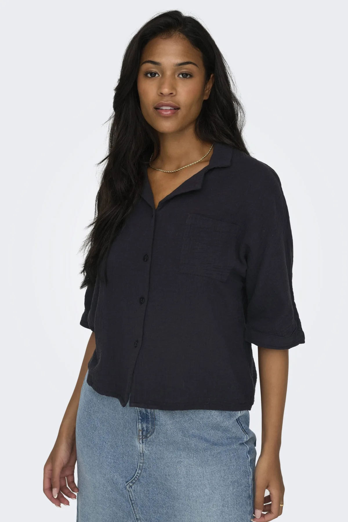 Blouse type: Klassieke blouse; Design: Knop placket, Revers kraag, Borstzak; Type sluiting: Knoopsluiting; Materiaal: Mousseline; Motief: Effen; Extra's: Op staal naden, Voelt zacht aan; Pasvorm: Losse pasvorm; Armlengte: Driekwart mouw; Lengte: Normale lengte