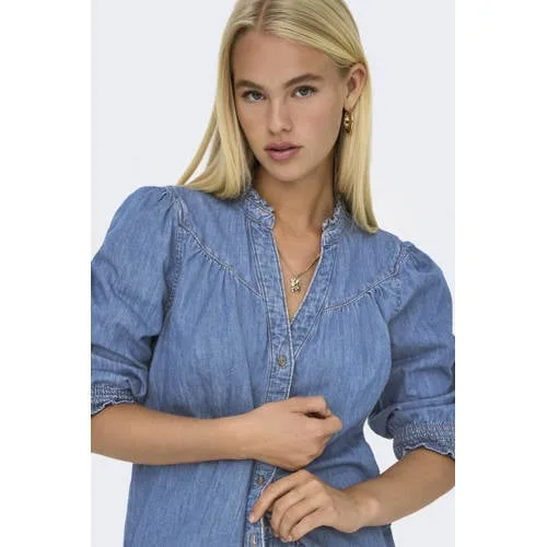 Jeansblouse van Only voor dames;Model 'Raya';Look: effen;Pasvorm: Regular fit ;Kraagmodel: Kraag met ruches;Details: Achterpas ;Hals: V-hals;Sluiting: enkele knoopsluiting;Mouwvorm: 3/4-mouw;Mouwboord: elastisch;Rompzoom: licht afgerond;Materiaalverwerking: Denim;Materiaal: puur katoen