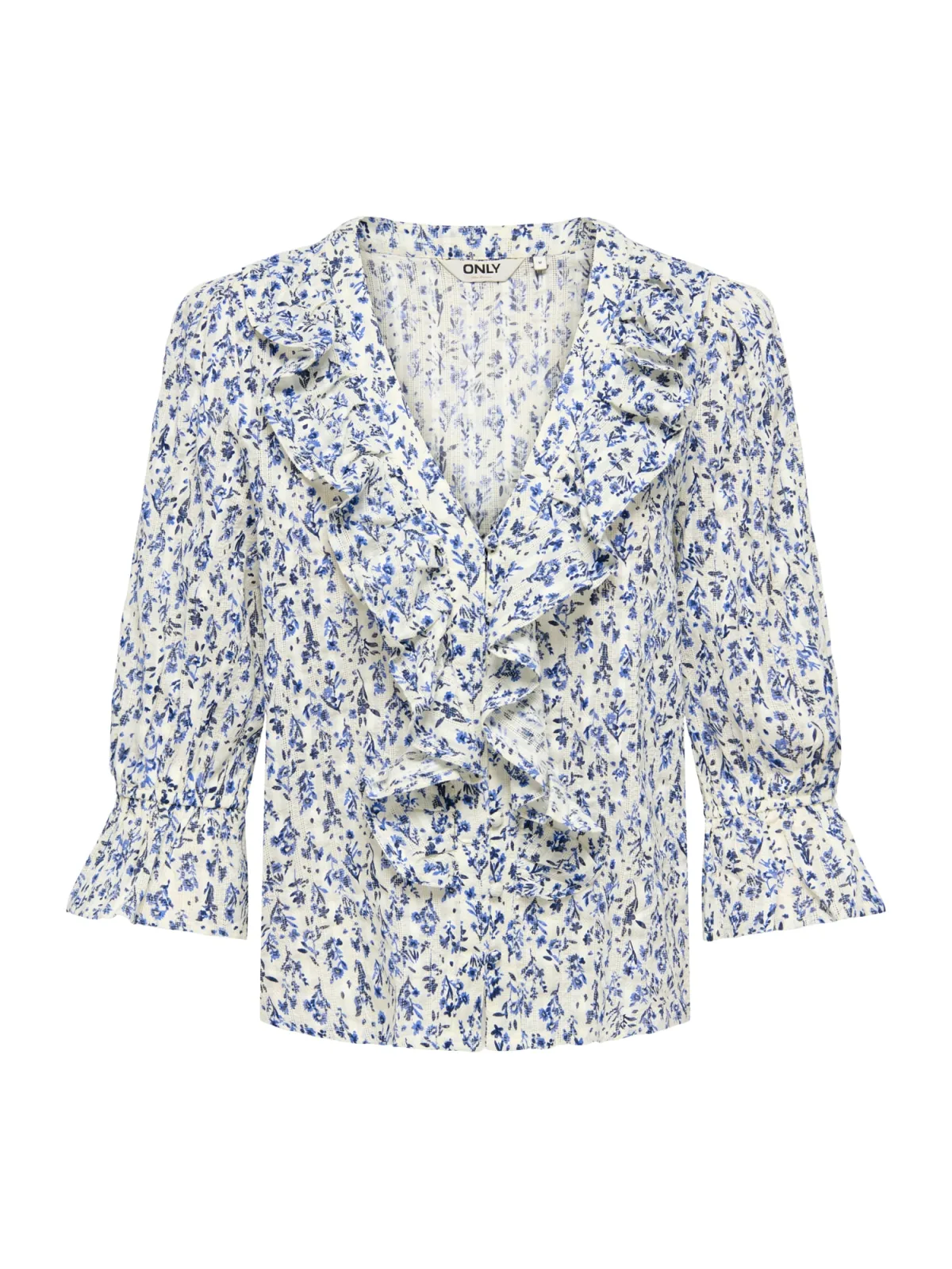 Blouse type: Klassieke blouse; Design: Gevoerde zoom/rand, Rechte zoom, Knop placket, Diepe snit/decolleté; Type sluiting: Knoopsluiting; Materiaal: Katoen; Motief: Bloemenprint; Kraag: Zonder kraag; Details: Ruches, Mesh; Extra's: All-over patroon, Op staal naden, Voelt zacht aan; Pasvorm: Normale pasvorm; Armlengte: Driekwart mouw; Lengte: Normale lengte