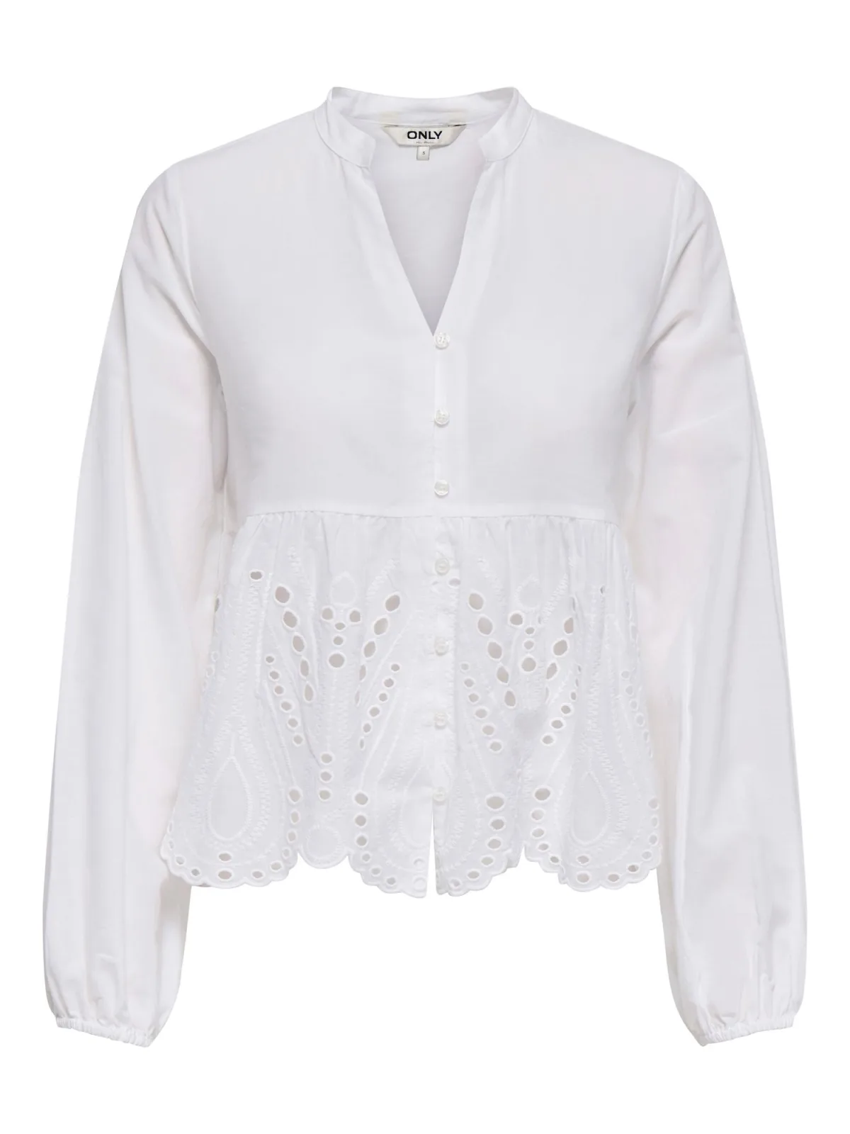 Dames Blouse van ONLY;Model 'Dewina';look: effen;Pasvorm: regular fit;kraagmodel: opstaande kraag;Details: opengewerkte broderiedetail, rimpeling;hals: V-hals;Sluiting: enkelrijige knoopsluiting;Mouwvorm: lange mouw;mouwboord: elastisch;Materiaal: puur katoen