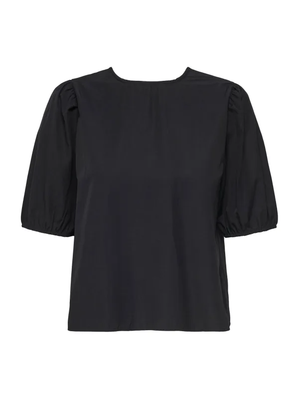Blouse type: Klassieke blouse; Design: Pofmouwen, Om te knopen/binden; Motief: Effen; Kraag: Zonder kraag; Details: Gedrapeerd; Extra's: Op staal naden, Voelt zacht aan; Pasvorm: Normale pasvorm; Armlengte: Halve mouw; Lengte: Normale lengte