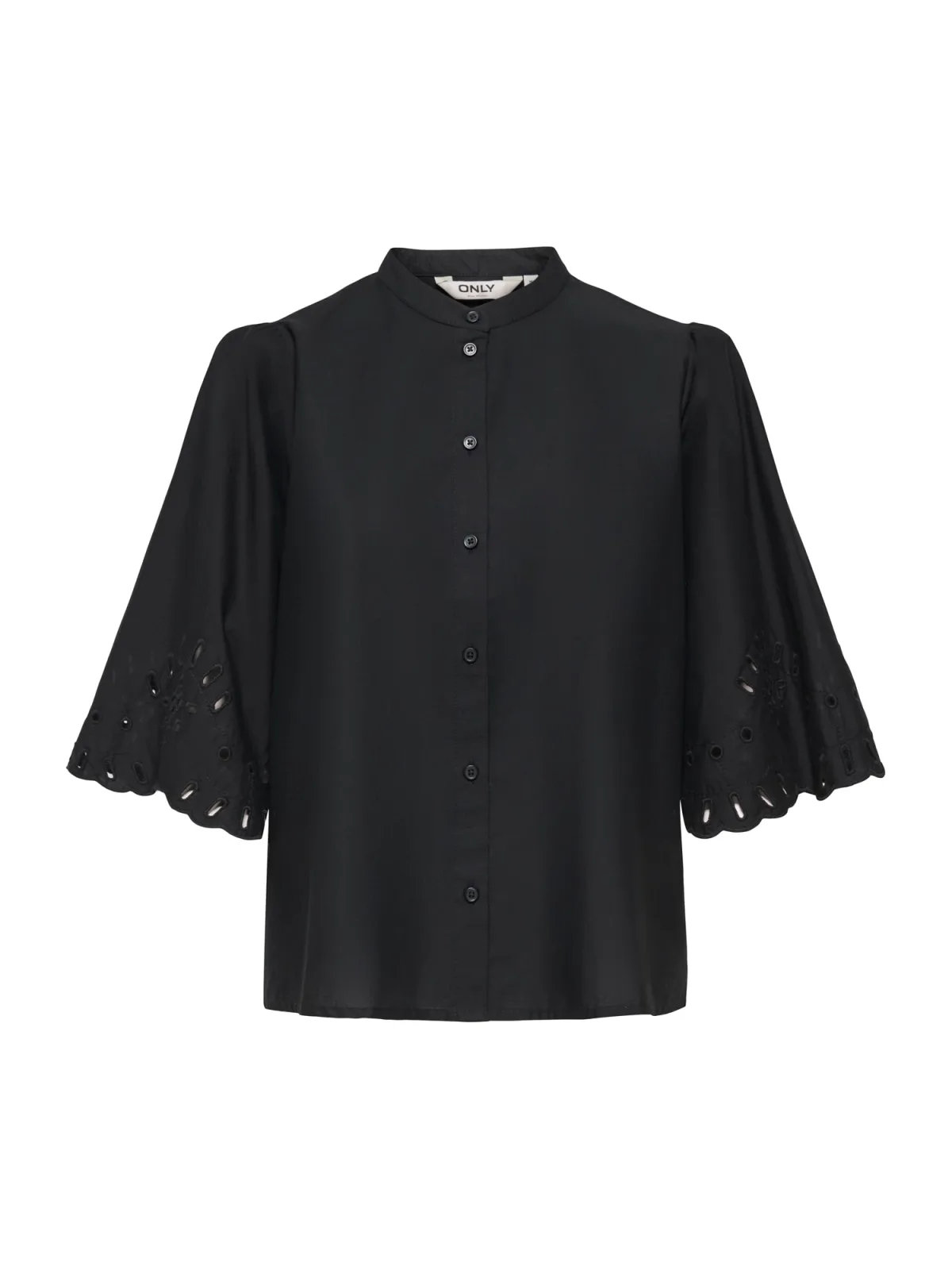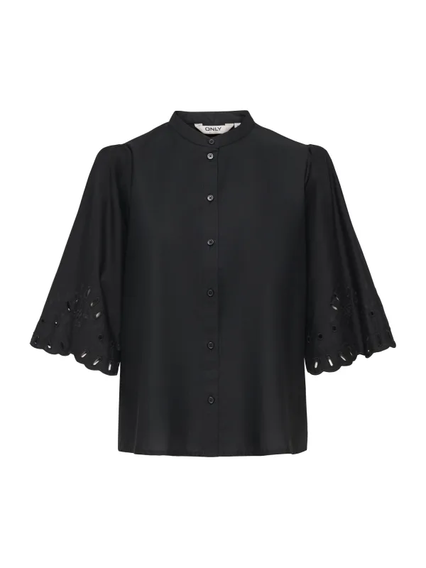 Blouse type: Klassieke blouse; Design: Gevoerde zoom/rand, Knop placket, Pofmouwen; Type sluiting: Knoopsluiting; Materiaal: Katoen; Motief: Effen; Kraag: Opstaande kraag; Details: Borduursels, Gedrapeerd, Mesh; Extra's: Op staal naden, Voelt zacht aan; Pasvorm: Normale pasvorm; Armlengte: Driekwart mouw; Lengte: Normale lengte
