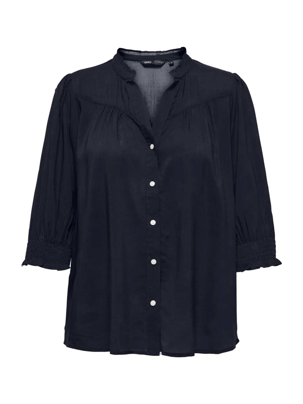 Blouse type: Klassieke blouse; Design: Placket, Elastische taille/zoom; Type sluiting: Knoopsluiting; Materiaal: Viscose; Motief: Effen; Kraag: Tuniek kraag; Details: Ruches, Plooien, Gedrapeerd; Extra's: Op staal naden, Gladde stof, Koele grip; Pasvorm: Normale pasvorm; Armlengte: Driekwart mouw; Lengte: Normale lengte