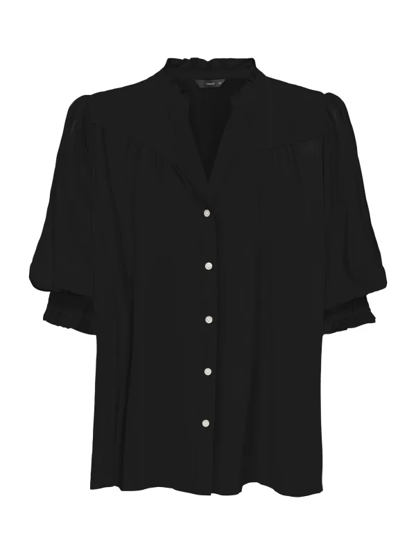 Blouse type: Klassieke blouse; Design: Placket; Type sluiting: Knoopsluiting; Materiaal: Viscose; Motief: Effen; Kraag: Tuniek kraag; Details: Ruches, Plooien, Gedrapeerd; Extra's: Op staal naden; Pasvorm: Normale pasvorm; Armlengte: Driekwart mouw; Lengte: Normale lengte