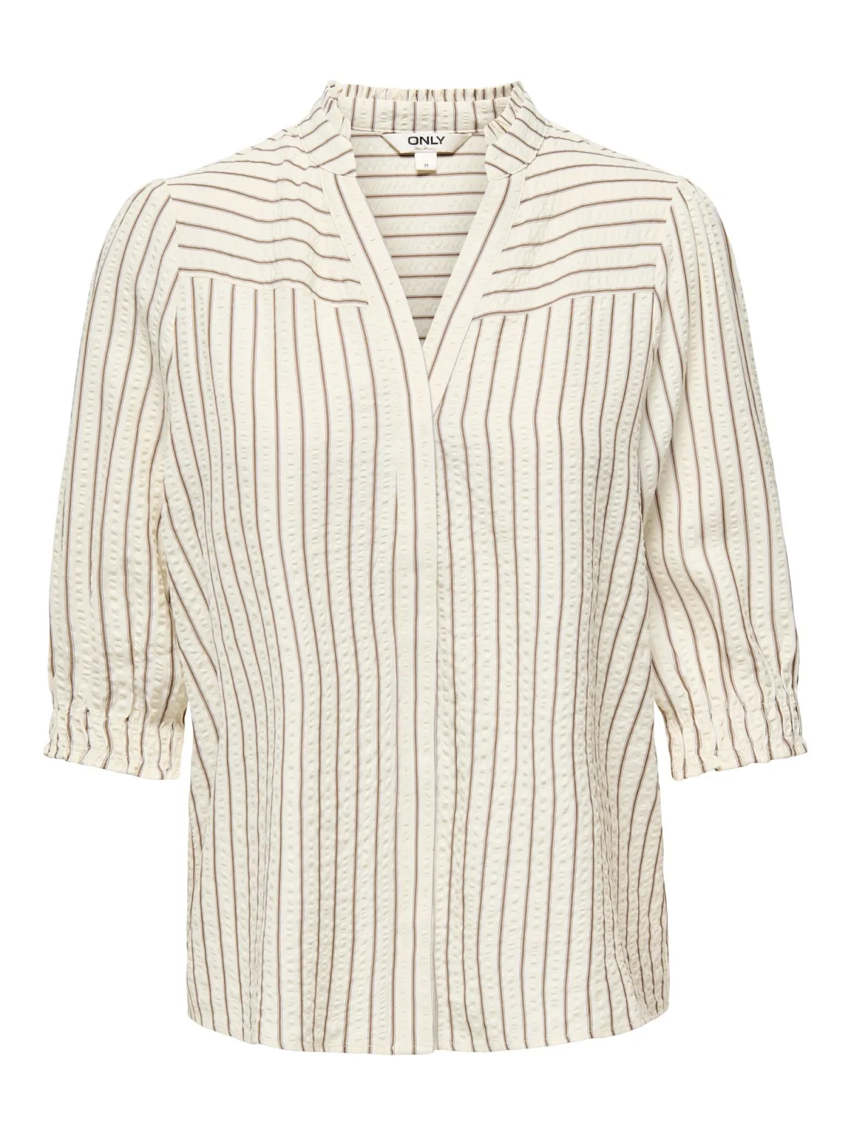 Blouse type: Klassieke blouse; Design: Elastische taille/zoom, Verborgen knop placket; Type sluiting: Knoopsluiting; Materiaal: Viscose; Motief: Gestreept; Kraag: Tuniek kraag; Details: Ruches, Gedrapeerd; Extra's: All-over patroon, Met textuur; Pasvorm: Normale pasvorm; Armlengte: Halve mouw; Lengte: Normale lengte