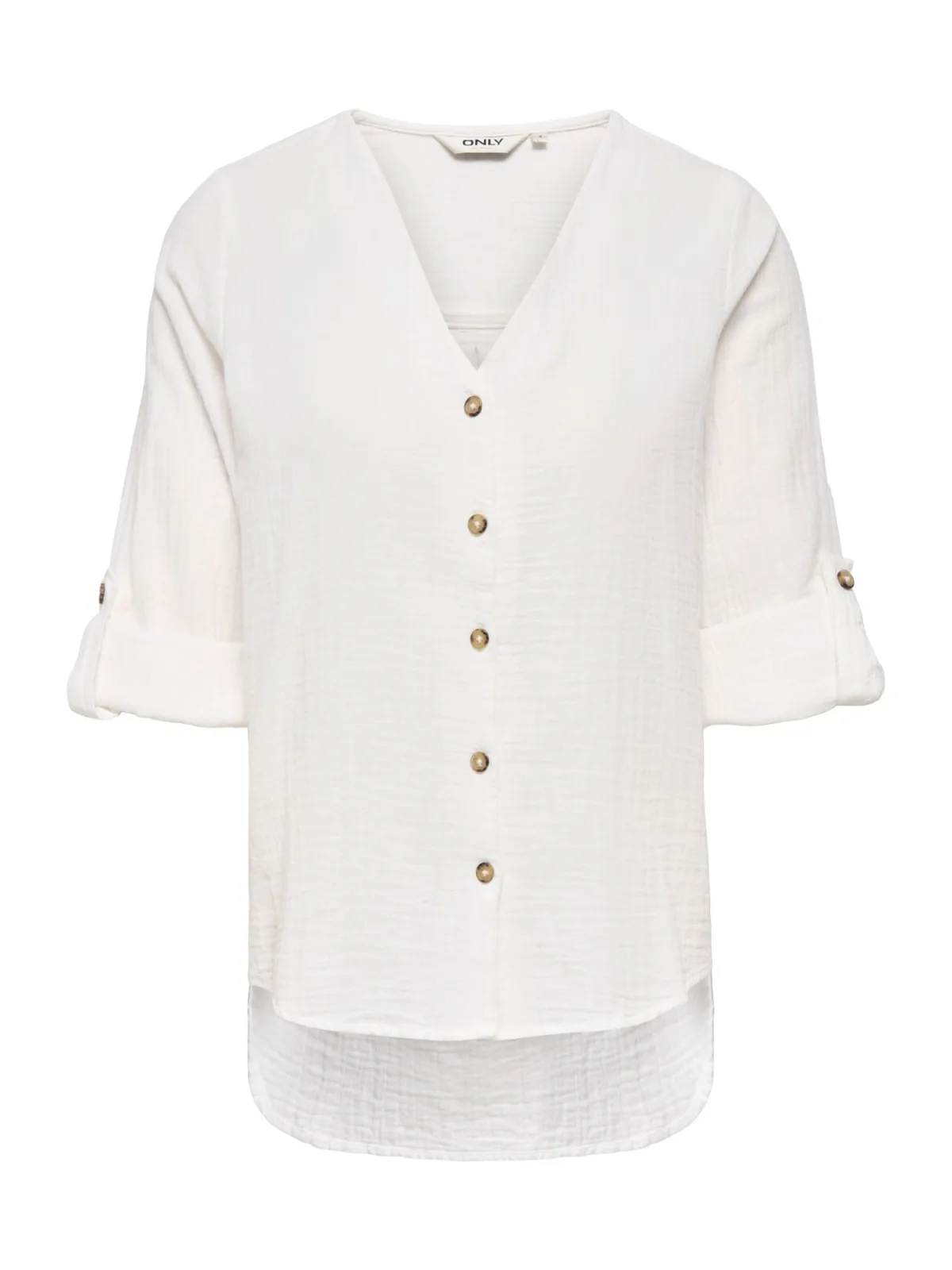 Blouse type: Klassieke blouse; Design: Rugplooi, Ronde zoom, Verlengd rugpand, Roll-up mouwen; Type sluiting: Knoopsluiting; Materiaal: Mousseline; Motief: Effen; Kraag: Zonder kraag; Details: Plooien; Extra’s: Lichte stof, Luchtige stof; Pasvorm: Normale pasvorm; Armlengte: Lange mouw; Lengte: Normale lengte