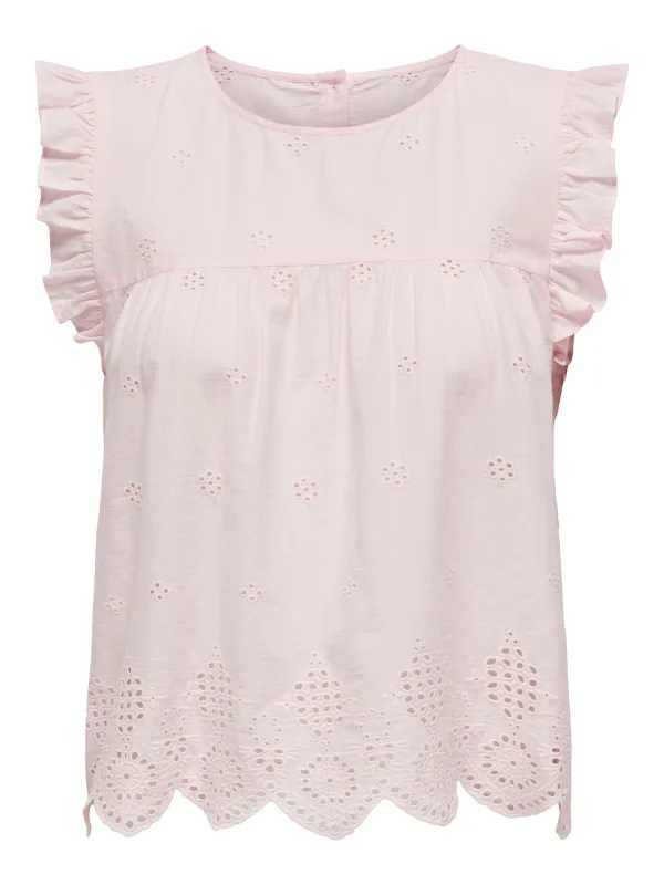 Blouse type: Blouseshirt; Design: Knop placket, Geschulpte zoom; Type sluiting: Knoopsluiting; Materiaal: Katoen; Halstype: Ronde hals; Motief: Effen; Kraag: Zonder kraag; Soort bandjes: Normale bandjes; Details: Ruches, Borduursels, Gedrapeerd, Mesh; Extra's: Op staal naden, Voelt zacht aan; Pasvorm: Normale pasvorm; Armlengte: Mouwloos; Lengte: Normale lengte