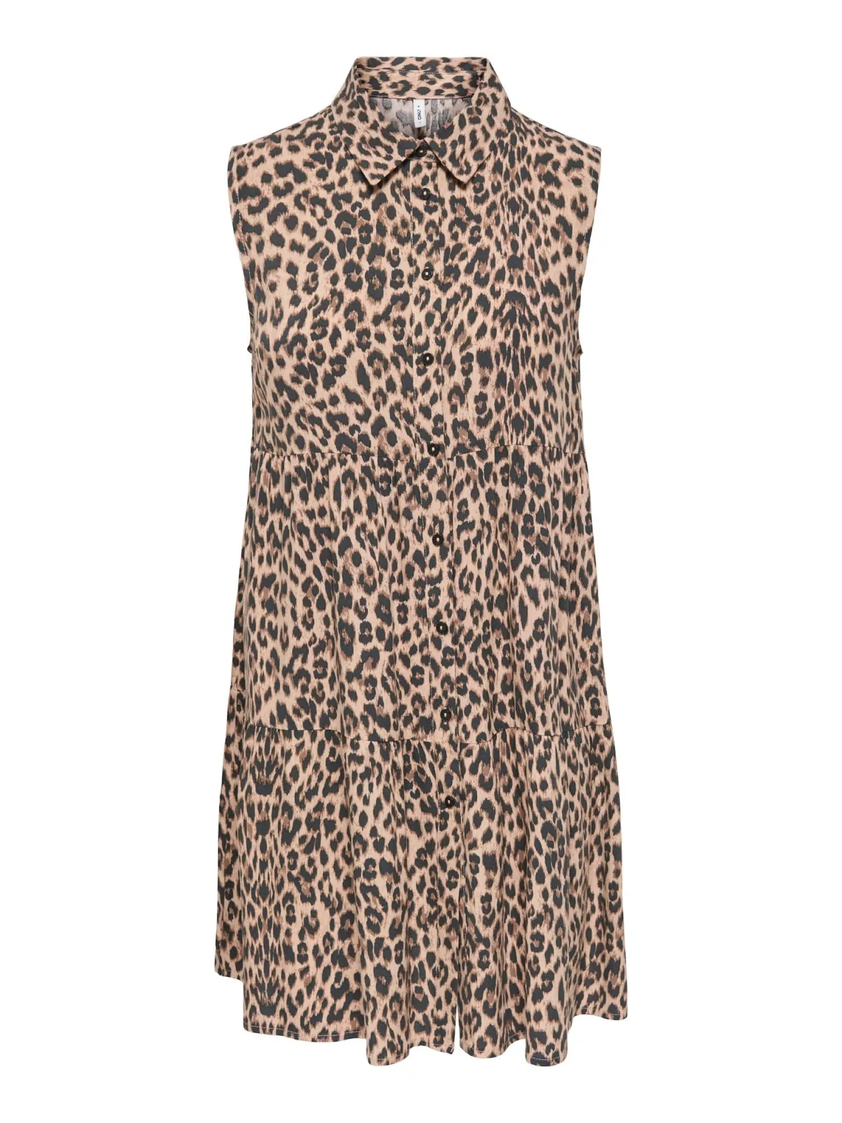 Design: Gevoerde zoom/rand; Type sluiting: Knoopsluiting; Materiaal: Viscose; Motief: Dierenprint; Kraag: Kentkraag; Details: Volant, Gedrapeerd; Extra's: All-over patroon, Gladde stof; Lengte: Kort/mini; Snit: Uitlopend; Pasvorm: Normale pasvorm; Armlengte: Mouwloos