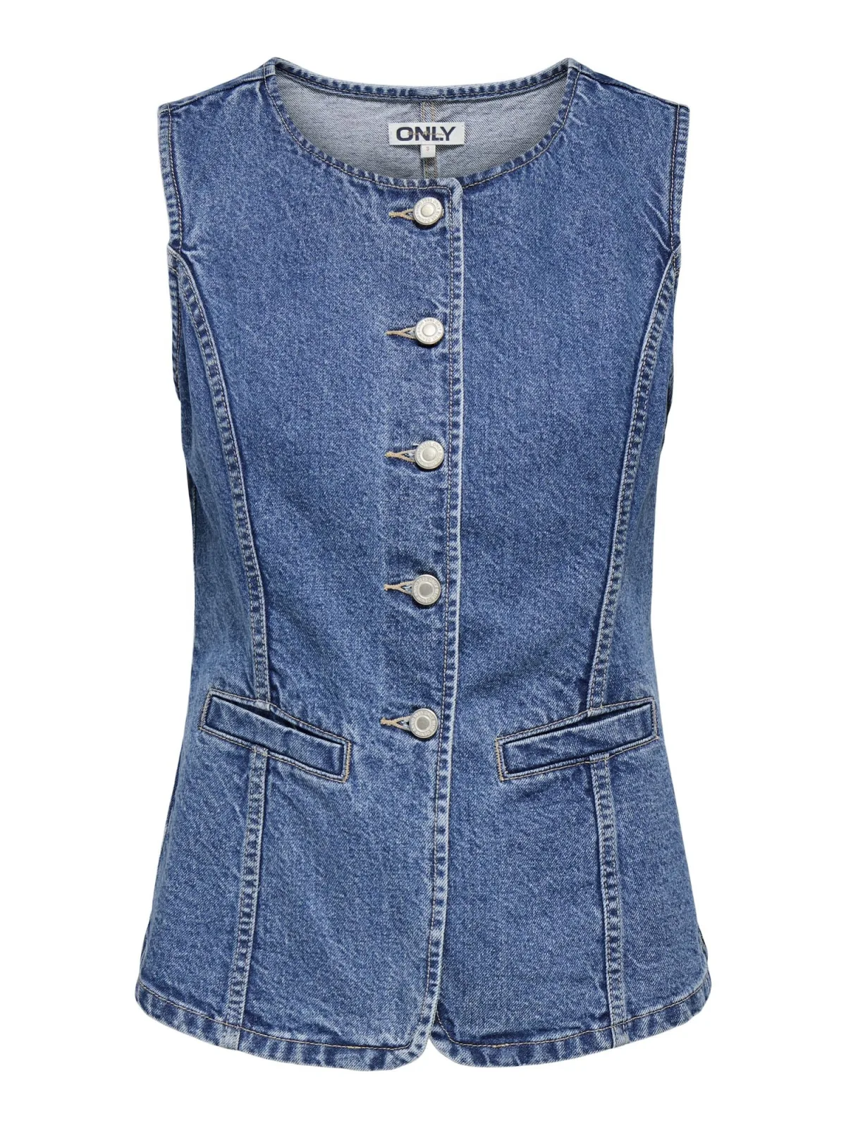 Dames Jeansgilet van ONLY;Model 'Guilina';Look: Denim;Hals: Ronde hals;Sluiting: enkelvoudige knoopsluiting;Tassen: Paspelzakken;Materiaal: puur katoen
