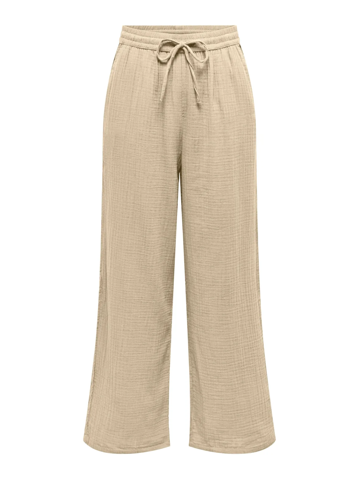 De beige ONLY wide leg broek is een ontspannen basisstuk voor elke dag. De lange, rechte pijpen vallen soepel langs je benen en geven een moderne, ruime look. Door de hoge taille sluit de broek mooi aan in de taille, terwijl de wijde pasvorm zorgt voor veel bewegingsvrijheid. Gemaakt van 100% katoen voelt de geweven stof comfortabel en luchtig aan, ideaal voor het voorjaar en milde zomerdagen.Comfortabele pasvorm voor elke dag Wide leg model met lange pijpen voor een losse, moderne uitstraling Hoge taille die prettig aansluit en de taille duidelijk benadrukt Elastische tailleband met koord voor extra comfort en een verstelbare pasvorm Gemaakt van 100% katoen, zacht en prettig om de hele dag te dragen Effen beige kleur die makkelijk te combineren is met tops en truien Handige zakken voor, fijn voor je telefoon of sleutels Maatadvies: valt normaal, waardoor je je gebruikelijke maat kunt kiezen Onderhoudsvriendelijk: wasbaar op 30 graden en lauw strijkbaarCasual broek voor jouw daily looksDeze lange casual broek uit de 'Daily' collectie is gemaakt voor alledaagse combinaties. Draag de wide leg stijl met een simpel T-shirt en sneakers op een vrije dag, of met een blouse en sandalen voor een nette, maar ontspannen look op kantoor.ONLY, vertrouwd in moderne damesmodeONLY staat bekend om toegankelijke, modieuze kleding die goed past in een druk dagelijks leven. De collecties draaien om draagbare trends, fijne pasvormen en betrouwbare basics. Deze broek sluit daar naadloos op aan en vormt een flexibele basis in je garderobe.Een ontspannen, katoenen broek die je met gemak keer op keer uit de kast pakt.