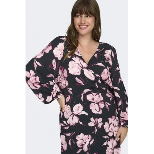 Deze jurk van ONLY CARMAKOMA heeft lange rechte mouwen en een V-hals. Deze jurk is gemaakt van viscose en heeft een bloemenprint. De lengte is middel, je draagt deze jurk makkelijk iedere dag.