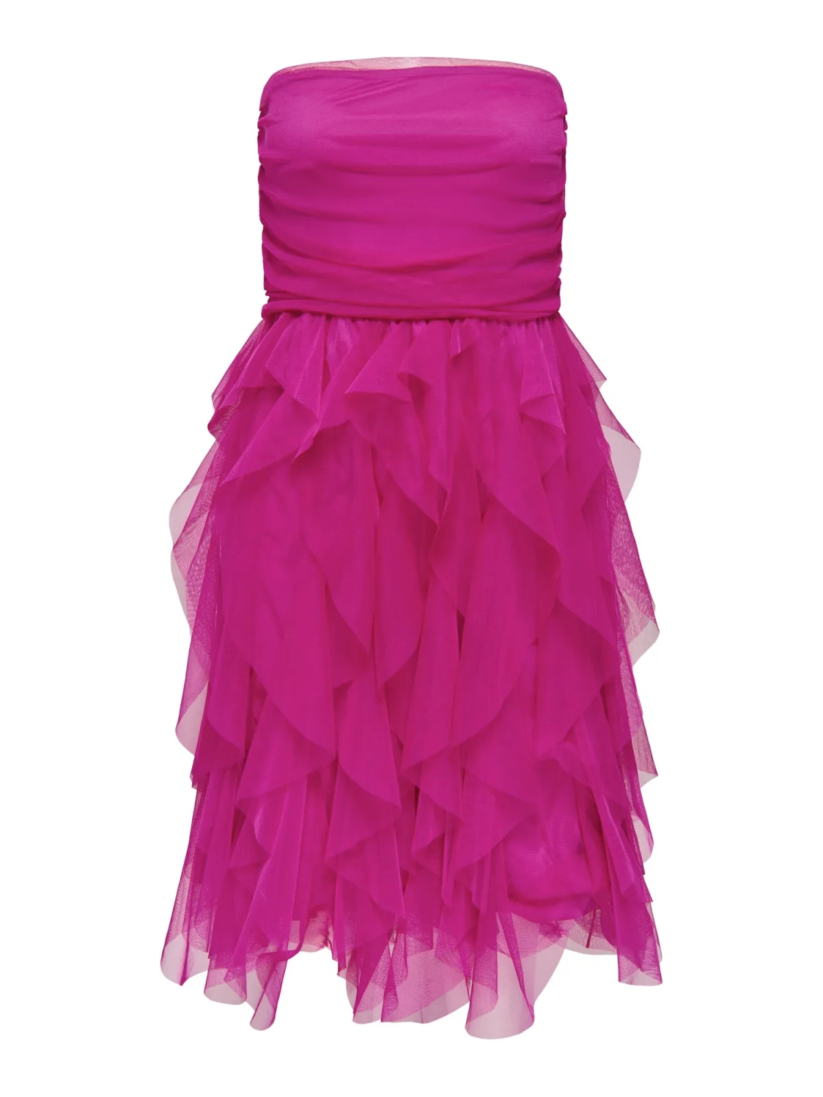 Design: Rug rits, Strapless/off-shoulder; Type sluiting: Ritssluiting; Motief: Effen; Soort bandjes: Bandeau; Details: Franjes, Volant, Gedrapeerd; Extra's: Op staal naden, Gladde stof; Lengte: Knielengte; Snit: Getailleerd; Pasvorm: Normale pasvorm; Armlengte: Mouwloos