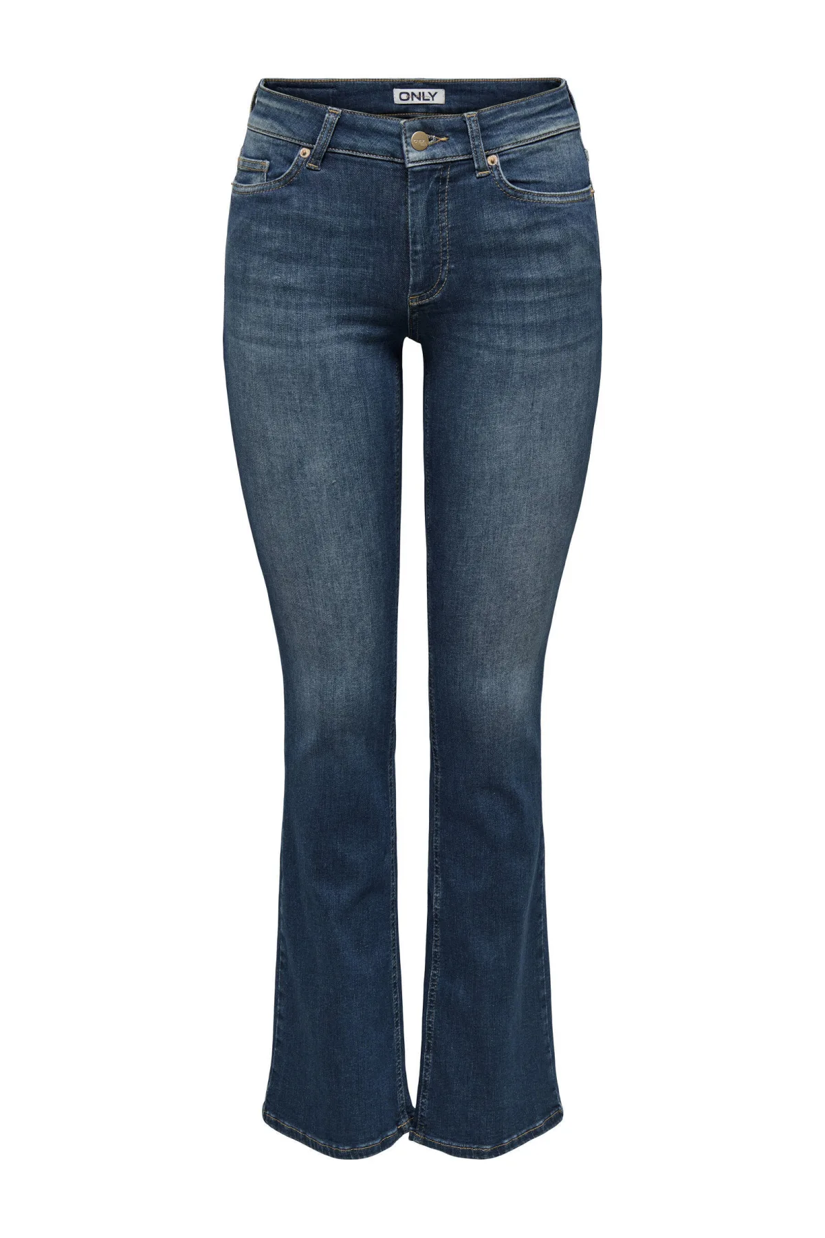 Damesjeans van Only;Model 'Blush';Pasvorm: Flared fit;Pasvorm volgens fabrikant: Flared, mid waist;Applicatie: Labelpatch, studs;Details: Riemlussen;Sluiting: Knoop en blinde ritssluiting;Zakken: 5-pocketdesign;Materiaal: Katoenmix;Bandwijdte bij maat S/32: 30 cm;Binnenbeenlengte bij maat S/32: 81 cm