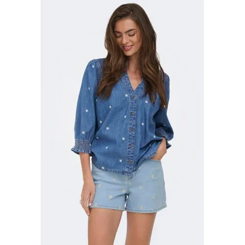 Voor een ontspannen dagelijkse look is deze denim dames top een goede basis in je garderobe. De top heeft een medium blue denim kleur die makkelijk combineert met jouw favoriete broeken en rokken. Het luchtige materiaal van 100% katoen voelt prettig aan op de huid, ideaal voor lentedagen. Door de subtiele bloemenprint krijgt de denim een zachte en verfijnde uitstraling.Details die je elke dag draagt Gemaakt van 100% katoen voor een soepele en ademende feel Medium blue denim kleur voor een casual uitstraling Driekwart rechte mouwen, prettig voor wisselende temperaturen Button down kraag voor een nette, maar relaxte look Bloemenprint voor een subtiel dessin Valt normaal volgens het maatadvies, kies je gebruikelijke maat Geschikt voor handwas, niet strijken en niet in de droogtrommel drogenAlledaags denim voor het nieuwe seizoenDeze top komt goed tot zijn recht in je dagelijkse outfits. Combineer met een lichte jeans voor een denim-op-denim look of draag hem op een zwarte broek voor meer contrast. De driekwart mouw maakt de top geschikt voor het lente seizoen en voor dagen waarop het binnen en buiten net iets frisser is.ONLY als vertrouwde stijlpartnerONLY staat voor moderne kleding voor elke dag, met aandacht voor pasvorm en trends. De collecties volgen het seizoen, zodat je makkelijk items vindt die aansluiten bij jouw stijl en dagelijkse leven. Deze top past daar goed in en vormt een vaste basis in je kledingkast.Een veelzijdig item dat je het hele seizoen makkelijk combineert.