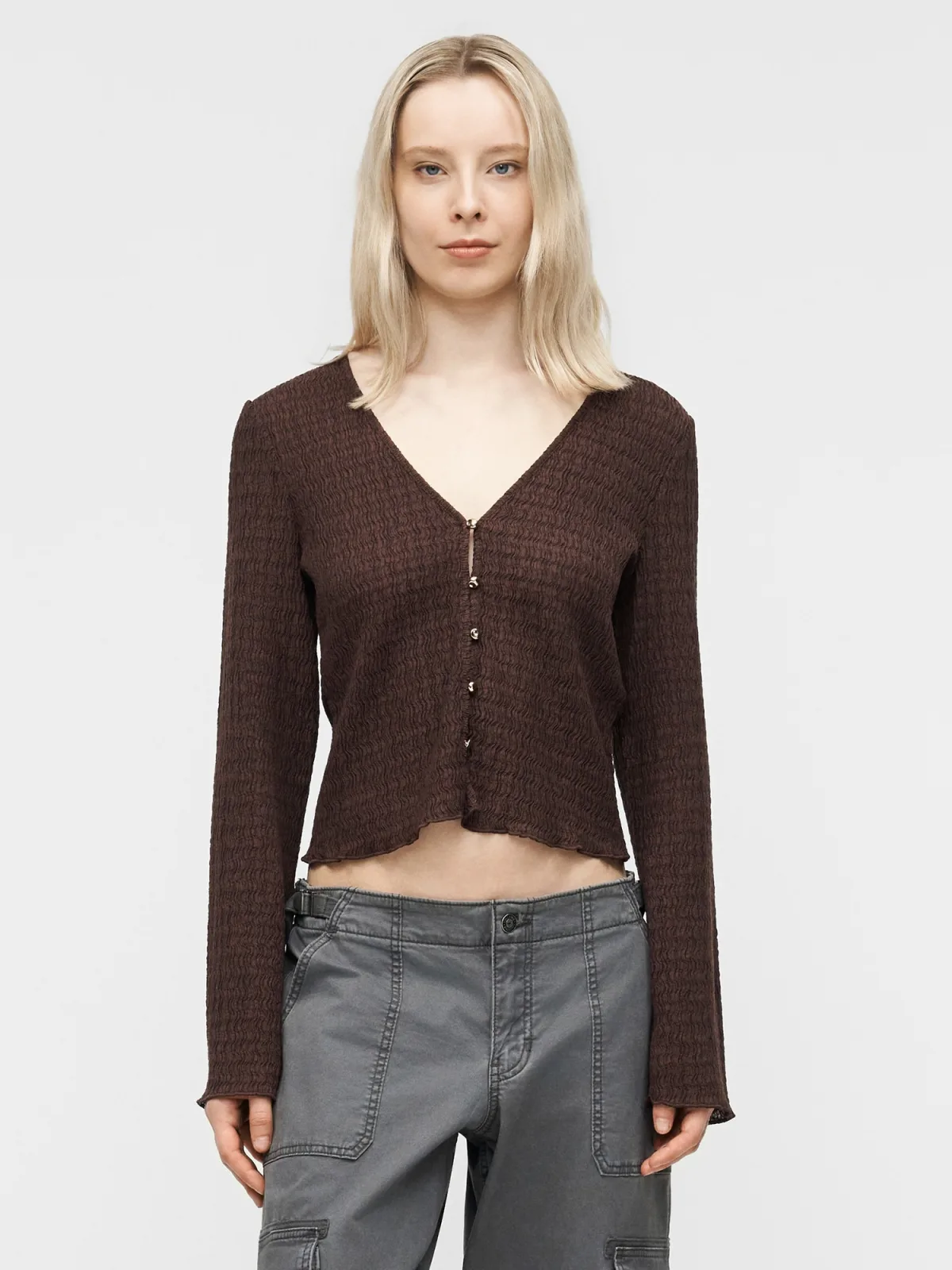 Design: Geschulpte zoom; Type sluiting: Knoopsluiting; Materiaal: Gerecycled materiaal; Halstype: V-hals; Motief: Effen; Extra's: Met textuur; Pasvorm: Normale pasvorm; Armlengte: Lange mouw; Lengte: Korte pasvorm