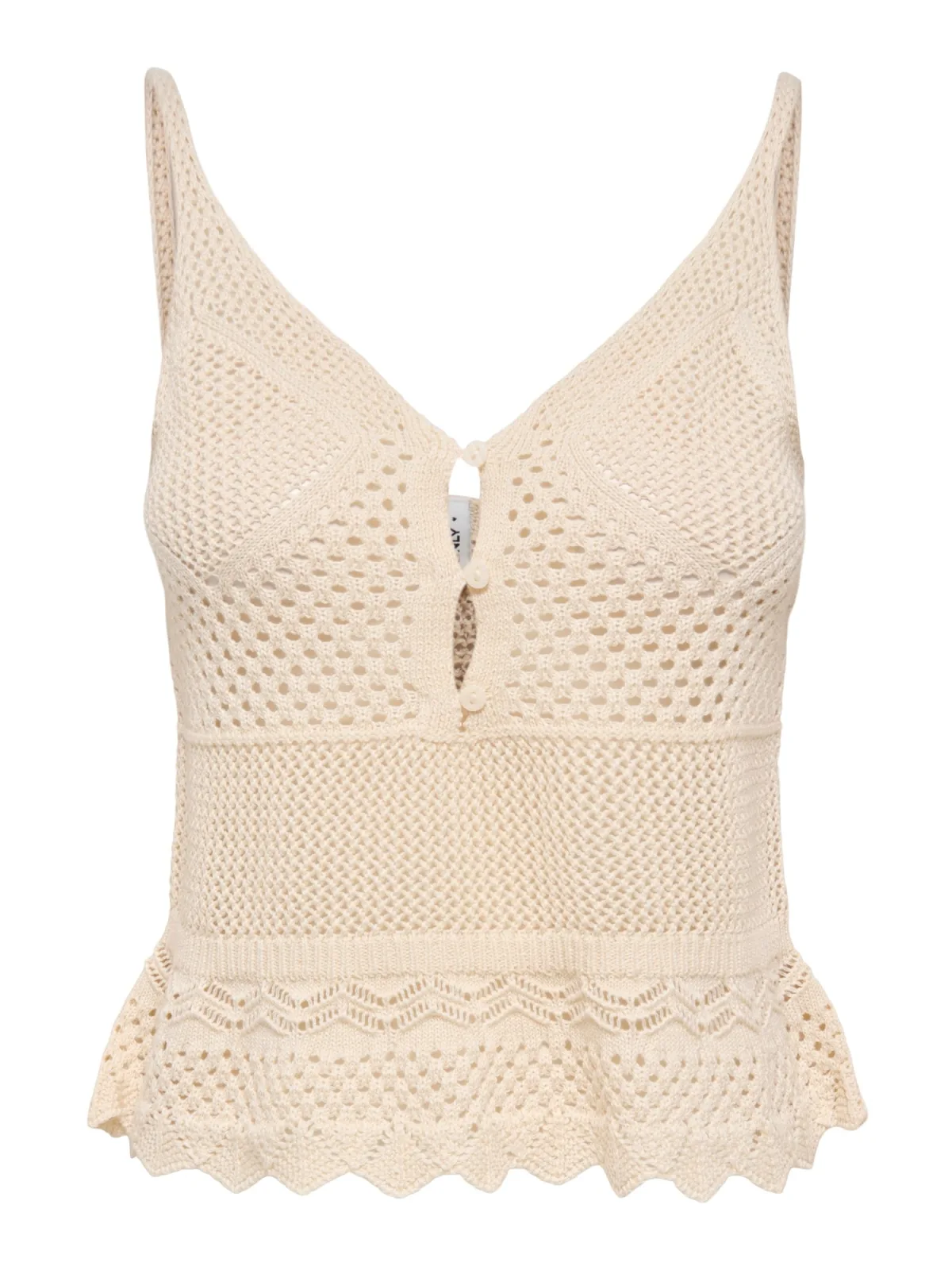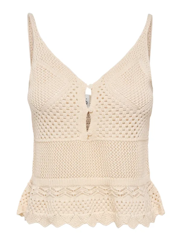 De ONLY gebreide peplum top in creme is een lichte, vrouwelijke basic voor elke dag. De top is mouwloos en heeft een V-hals, waardoor hij luchtig aanvoelt en ideaal is voor het voorjaar. Het gebreide patroon met crochet details geeft een subtiele structuur, terwijl de peplum onderaan zorgt voor een speelse vorm rond de heup.Details die je elke dag kunt dragen Mouwloze top met V-hals, geschikt om los te dragen of onder een vest of blazer Gebreide stof met crochet details voor een verfijnde uitstraling Peplum model dat licht uitloopt aan de onderkant Effen creme kleur die makkelijk combineert met jeans, rokken en shorts Knoopsluiting aan de voorkant voor eenvoudig aan- en uittrekken Gemaakt van 50% katoen en 50% acryl, voelt zacht en soepel aan Wasbaar op 30 graden, lauw strijkbaar (1 punt) en niet drogen in de droogtrommel Maatadvies: dit artikel valt normaalComfortabel in je dagelijkse routineDeze top komt goed tot zijn recht in je dagelijkse garderobe. Combineer hem met een straight jeans voor een relaxte look of met een nette broek voor een meer geklede combinatie. Door het mouwloze model is hij ook prettig onder een jasje in wisselvallig lenteweer.ONLY: moderne stijl voor elke dagONLY ontwerpt mode die goed aansluit op een druk dagelijks leven, met items die gemakkelijk te combineren en te onderhouden zijn. Deze top past in de dagelijkse collectie en biedt een toegankelijke stijl die je het hele seizoen door kunt dragen.Een lichte, gebreide basic die je garderobe rustig en verzorgd laat aanvoelen.
