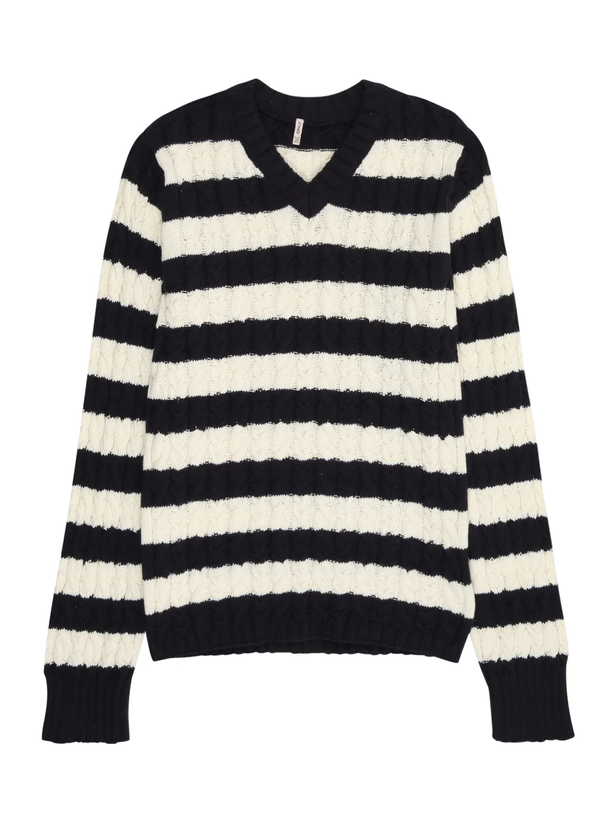 Design: Geribbelde kraag, Geribd ceintuurtje, Vlecht brei; Materiaal: Knitwear; Halstype: V-hals; Motief: Gestreept; Extra's: Fully fashioned, Voelt zacht aan; Pasvorm: Losse pasvorm; Armlengte: Lange mouw; Lengte: Normale lengte