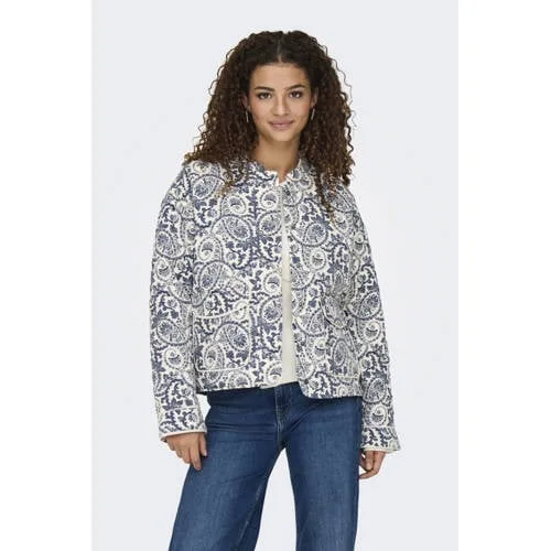 Dit stijlvolle damesjas van ONLY, model ONLHALLIE, heeft een ronde hals en een knoopsluiting. De jas is blauw met wit en ideaal voor de lente. De lange mouwen en zakken aan de voorkant maken het helemaal af.