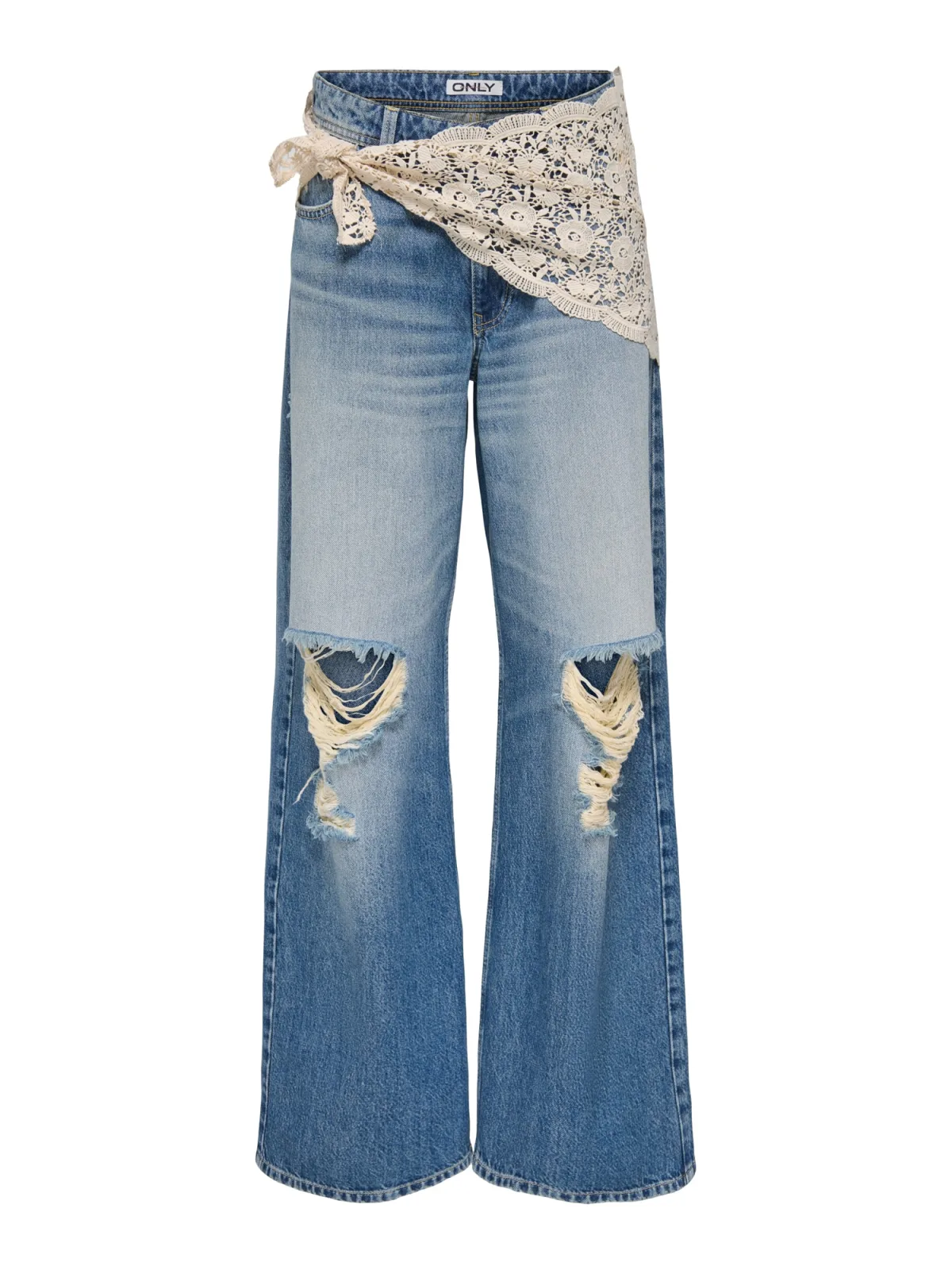 Design: Gevoerde zoom/rand, Ritssluiting, Om te knopen/binden, 5-pocket-style; Type sluiting: Ritssluiting; Materiaal: Gerecycled materiaal; Motief: Color-Blocking; Details: Cut-outs, Kant; Extra's: Contrasterende naden, Gewassen effect; Wassing: ripped; Lengte: Lang/maxi; Pasvorm: Wide leg; Taillehoogte: Mid waist